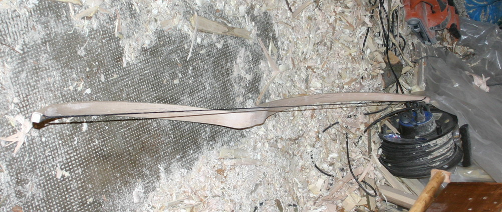 Der Rohling hat nun eine Breite an den FA von 3,5 cm vollpyramidal auslaufend auf 12 mm an den Tips. Der Rohling hat eine Länge von stolzen 1,90 m, Wurfarmlänge jeweils 90 cm. Ich habe die WA auch in der Dicke zurückgenommen, so dass sie sich im Bodentiller schon richtig schön biegen. Ich möchte bewusst kein hohes Zuggewicht.