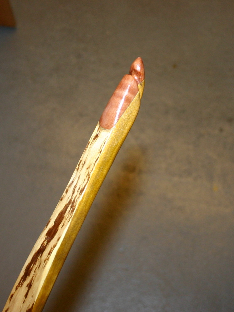 Zunächst hat der Bogen zwei Overlays aus Elsbeere bekommen. Ich nehme in letzter Zeit fast nur Elsbeere, da diese extrem hart ist und die Bearbeitung der Overlays zwar schwer aber zuverlässig erfolgen kann. Oft ist mir bei anderen Hölzer mal beim Raspeln und Feilen ein Stück Holz abgeplatzt, bei Elsbeere erscheint mir dies fast unmöglich. Danach habe ich den Bauch gebeizt, der Rücken blieb mit seinen Bastresten natur. Anschließend bekam der ganze Bogen die erste Lage Schellack.