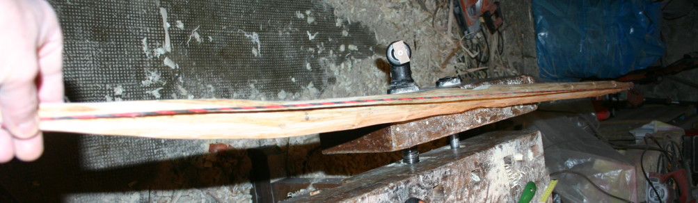 Mit der überlangen Tillerschnur ging es ganz flott und die Standhöhe war schnell erreicht. Er war aber noch viel zu stark und so habe ich die beide Wurfarme gleichmäßig geschwächt. Damit diese auch mehr "rumkommen" mußte ich natürlich die Biegung so nah wie möglich an den Griff bekommen. Dabei habe ich es beim linken Wurfarm etwas übertrieben, da biegt er zu griffnah.