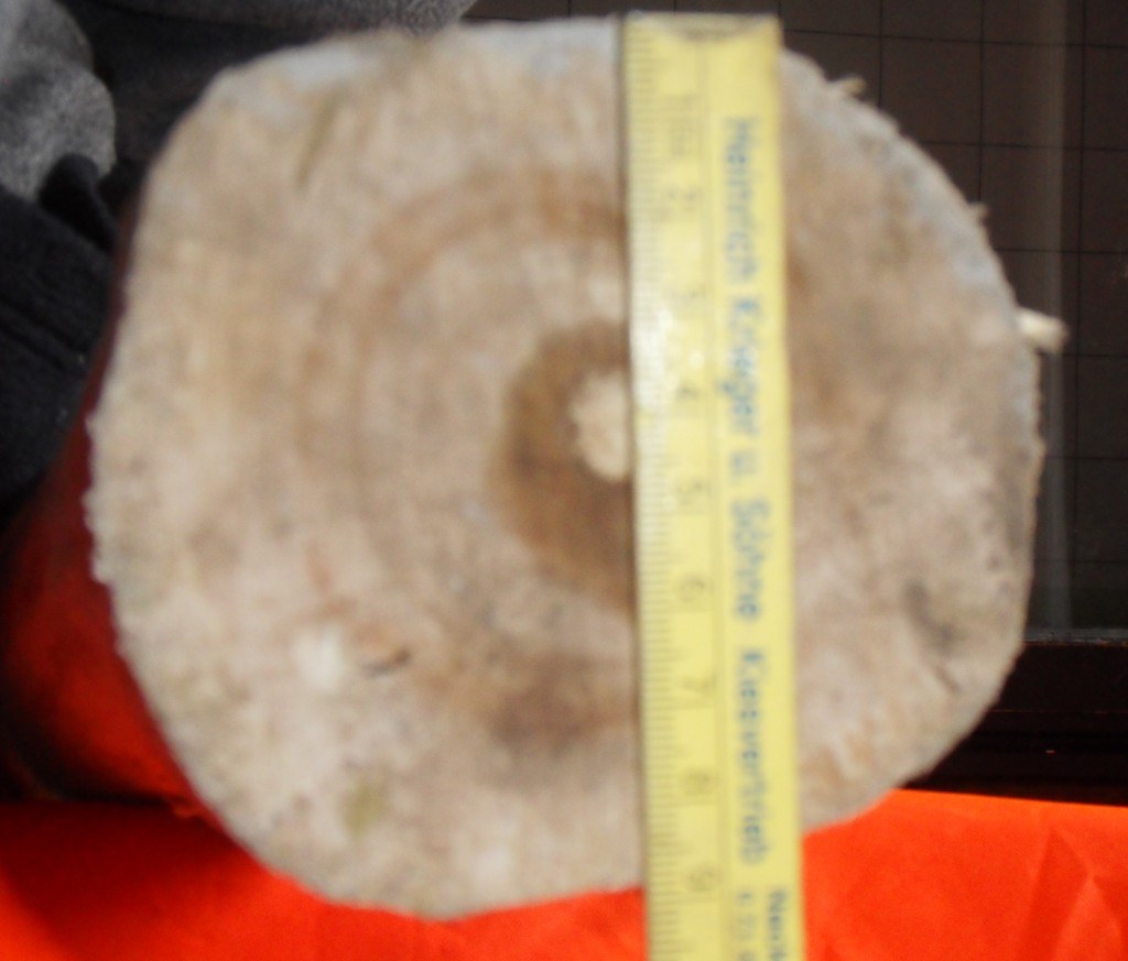 So, der Holunder hat einen Durchmesser von 9cm. Kann man ihn spalten? Soll man ihn spalten? Und das Braune ist Kernholz, oder? Ja, klar ist das Kernholz.... Aber der Unterschied ist krass, wenn man beide Enden vergleicht: Und wenn man ihn nicht spalten soll, dann gleich zum Markkanal runterarbeiten?