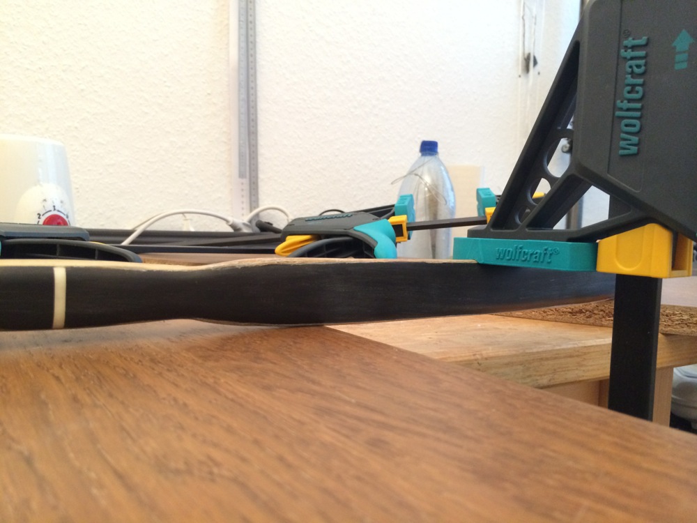 3) Bogen mit Asa Gezi auf ein Brett fixieren und nach Erhitzen mit der HLP mit einer Zwinge runterdrücken bzw. hochkeilen. Hat den Vorteil, dass man beide ent-twist-Korrekturen gleichzeitig machen kann.