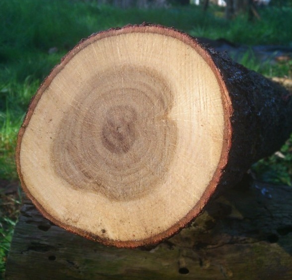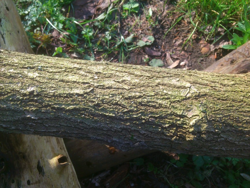 Vielleicht erkennt ja jemand den lustigen weißen Ring um´s Kernholz im ersten Fall wieder, die Rinde läßt mich an was abstrakt obstiges denken, frischer Anschnitt roch irgendwie süß. Im zweiten Fall stehe ich völlig im Regen, haselnußbrauner Kern, Geruch nach nichts anderem als frischem nassen Holz. Wie dem auch sei, ich hab was zu spielen und die zwei mir eingeräumten Raummeter bieten noch soviel Platz, daß ich ihn schlimmstenfalls mit Hainbuche füllen kann, die erkenne sogar ich.