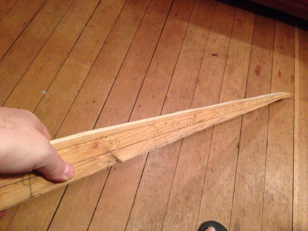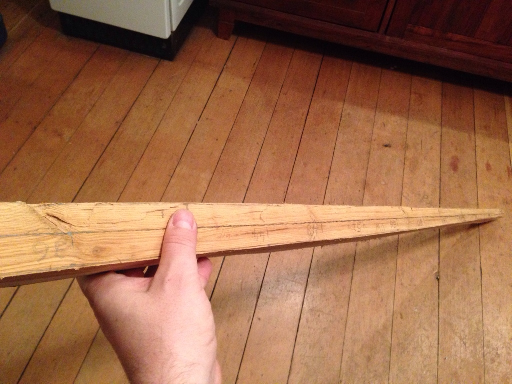 Lang ist der Stab 203cm, breit in der Mitte 4cm, tief 3,7cm und an den Enden 2cm breit, der Dickentaper kommt später.
