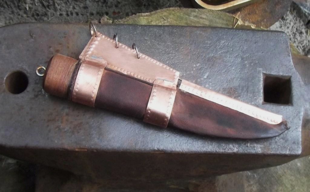 In Ermangelung von Kupfernietstiften habe ich die Streifen Geklammert und die Scheidenspitze geklebt u. gelötet