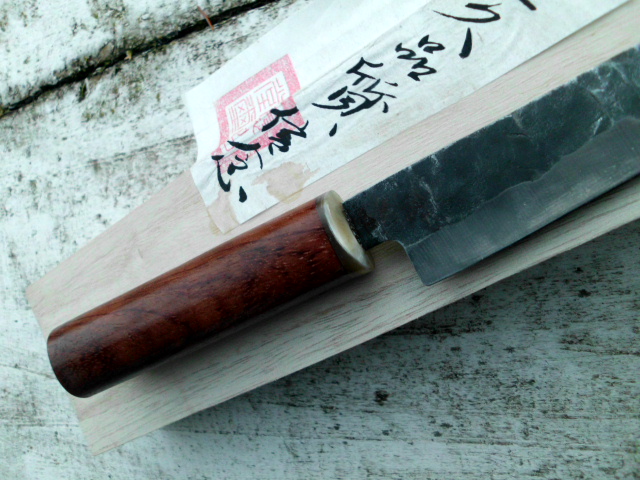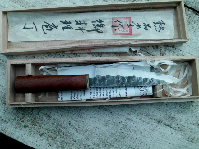 Messer ist angekommen. Von der Form her ist es aber eher ein Gyuto oder Tako hiki als ein Santoku. trotzdem gefällt es mir (für den Preis) ganz gut. Noch ist bei mir auch der Griff in Ordnung. Der wird erst gewechselt wenn er wackelt.