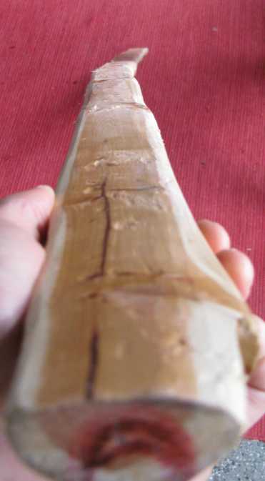 Liegt im Halbstamm der Markkanal nicht mittig, bekommste Probleme. Selbst wenn der trockene Stave gerade scheint, verbiegt sich nach dem Ausschneiden der Bogen wie eine Banane.
