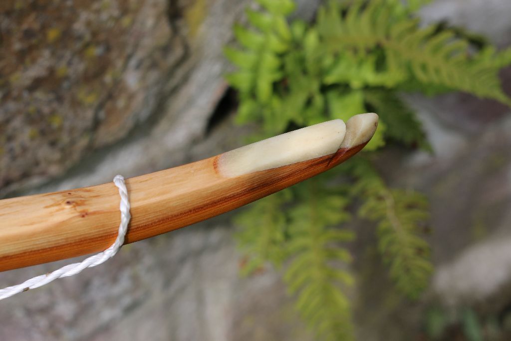 Griff: Ohne alles. Einzig eine Intarsie aus Hirschgewei habe ich eingelassen, damit die Pfeile keine Kratzer auf das Holz machen. Der Griffbereich ist steif belassen, da klar war, dass der Griff zu dünne würde, wenn ich den mitbiegen lasse. Das greift sich dann nicht mehr so gut. Daher habe ich ihn hier dicker gelassen. Aber auch nur so dick, dass man ihngerade noch so gut greifen kann