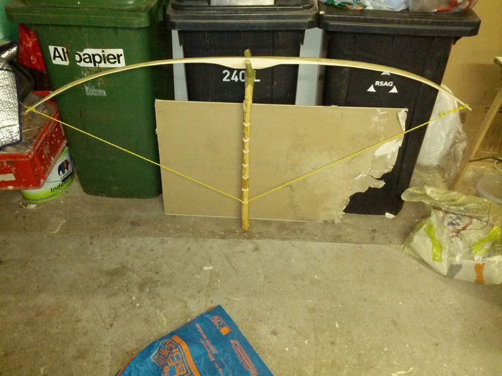 Die Sehne ist nun fast Standhöhe. Muss das mit dem Bogenbauerknoten noch üben. Der ist auch dafür verantwortlich, dass die Sehne nicht zentriert aufliegt, deswegen ignoriere ich diese Problematik erst mal.