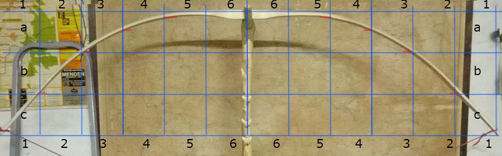 Die Steifen Tipps (die letzten 22 cm) sind absichtlich steif. Ich habe gelesen, dass steife Enden sich positiv auswirken. (Prinzip: Ein Speer ist mit Speerschleuder weiter zu werfen als mit dem Arm). Eine griffnahe Biegung sollte bei sehr breiten Bögen möglich sein. Ich habe etwa 5 cm Breite in den ersten 2/3 der Wurfarme.