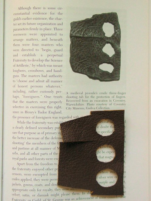 Bei Dr. E. Mylius' "Das Bogenschießen als Sport und zum Jagdgebrauch", erschienen in Leipzig im Jahr 1910, ist ein ähnliches Tab, wie das im Bogenbauerbuch, auf Seite 47 abgebildet, jedoch nur mit einem Loch für den Zeigefinger und den Ringfinger. Für den Mittelfinger gibt es einen freien Raum, wie der Spalt für den Pfeil, nur breiter. Er nennt dieses Teil übrigens "Lappen". :)