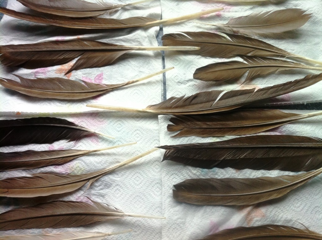Bei den Federn kann man bei entsprechender Größe alles Verwenden, dabei auf einen Pfeil aber nur die gleichen Teile gleicher Federn. Also z.B. Pfeil 1 nur die Fahnen von 3 RW Federn, Pfeil 2 nur die Gegenfahnen der 3 RW Federn, Pfeil 3 die Fahnen von 3 LW Federn und so weiter. Auf keinen Fall RW und LW Federn mischen, auch nicht RW Fahne mit LW Gegenfahne auf einen Pfeil bringen, die Biegungen der Federn sind zu Unterschiedlich.