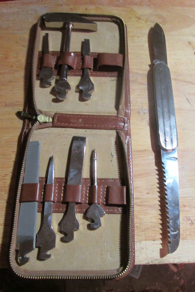 Es kommt mit einem schönen alten Lederetui, einem Messer und diversen " Anbauteilen ".