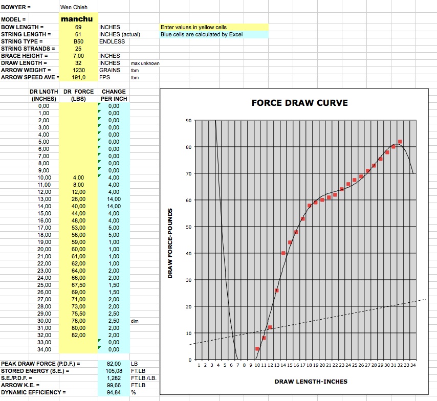 @Benz: Erst einmal vielen Dank für das Erstellen dieses Fadens. Das wird sicher einige Erkenntnisse geben. Um sicherzustellen, dass Kurvenverläufe klar erkannt werden, müssen die dargestellten Längeneinheiten von Zuggewicht und Auszugslänge bei den verschiedenen Graphs übereinstimmen, z.B. wie beim Kaya 5 lb zu 1" als quadratisches Kästchen. Der Graph zum Manchubogen über diesem Post ist überhöht, eventuell mag das jemand umzeichnen?