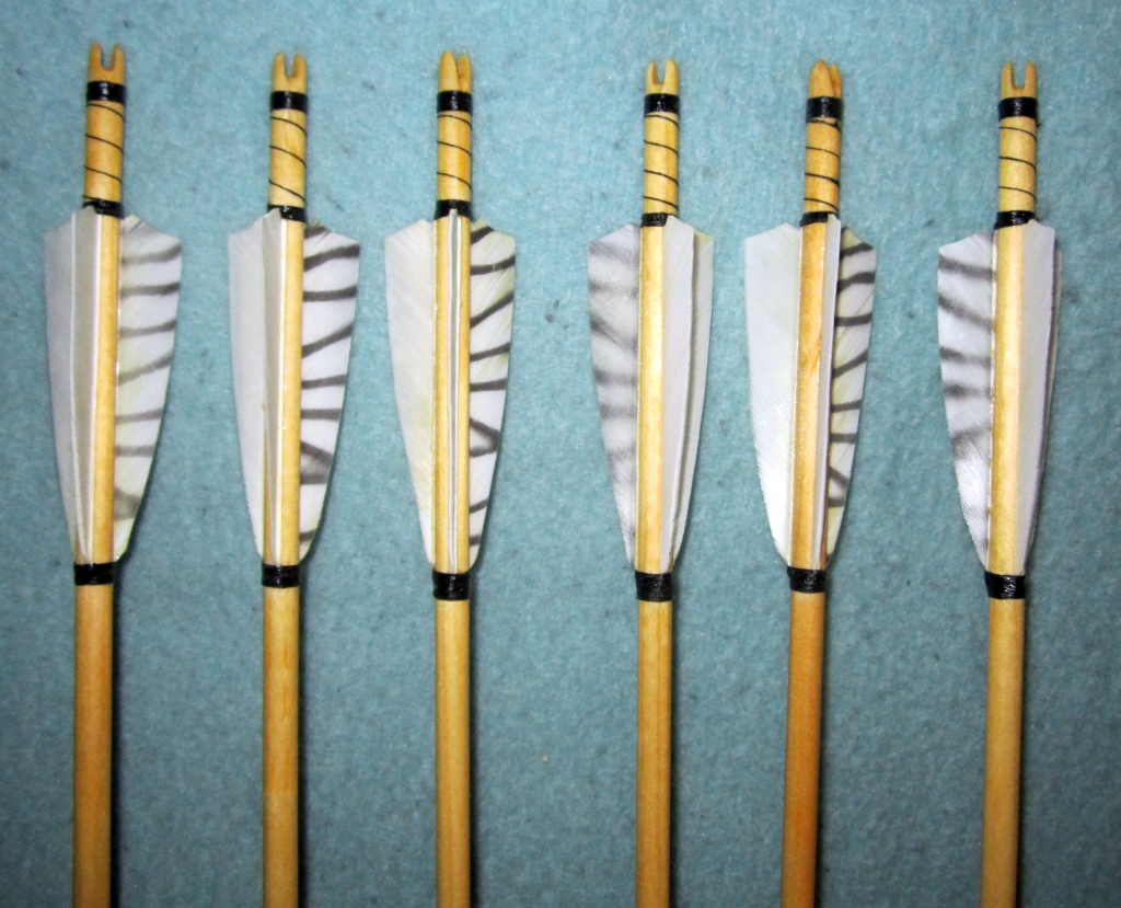 (komisches Wortgefüge) und an den anderen Dingern Spitzen ran zu machen) erst in ein paar Wochen ankommt, habe ich damit angefangen mir mit den Pfeilbau die Zeit zu vertreiben. Da das auch meine ersten Pfeile sind finde ich sie recht gelungen, obwohl ich die Federn bei meinem zweiten Pfeil falsch aufgeklebt habe. Trotzdem bin auch etwas entäuscht, weil ich gehofft habe, dass sie besser werden. Für das Cresten werde ich mir noch was überlegen da die paar Ringe relativ schief geworden sind.