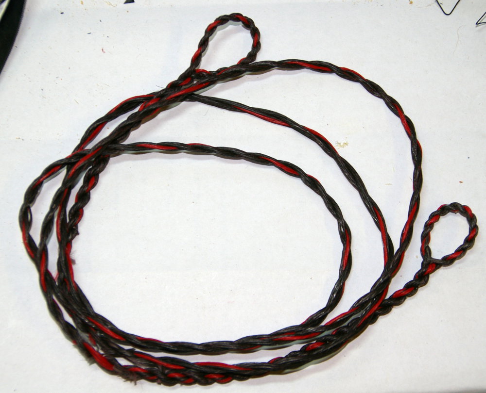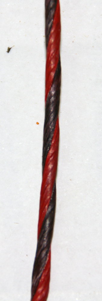 Wenn es richtig geklappt hat, dann sind die Fasern zwischen den beiden eingedrehten Bereichen der Ohren garnicht in sich gedreht und ergeben einen sehr runden Sehnenquerschnitt nach dem Eindrehen. Dann kann man bei der fertigen Sehne nur noch an der Farbe die einzelen Stränge erkennen.