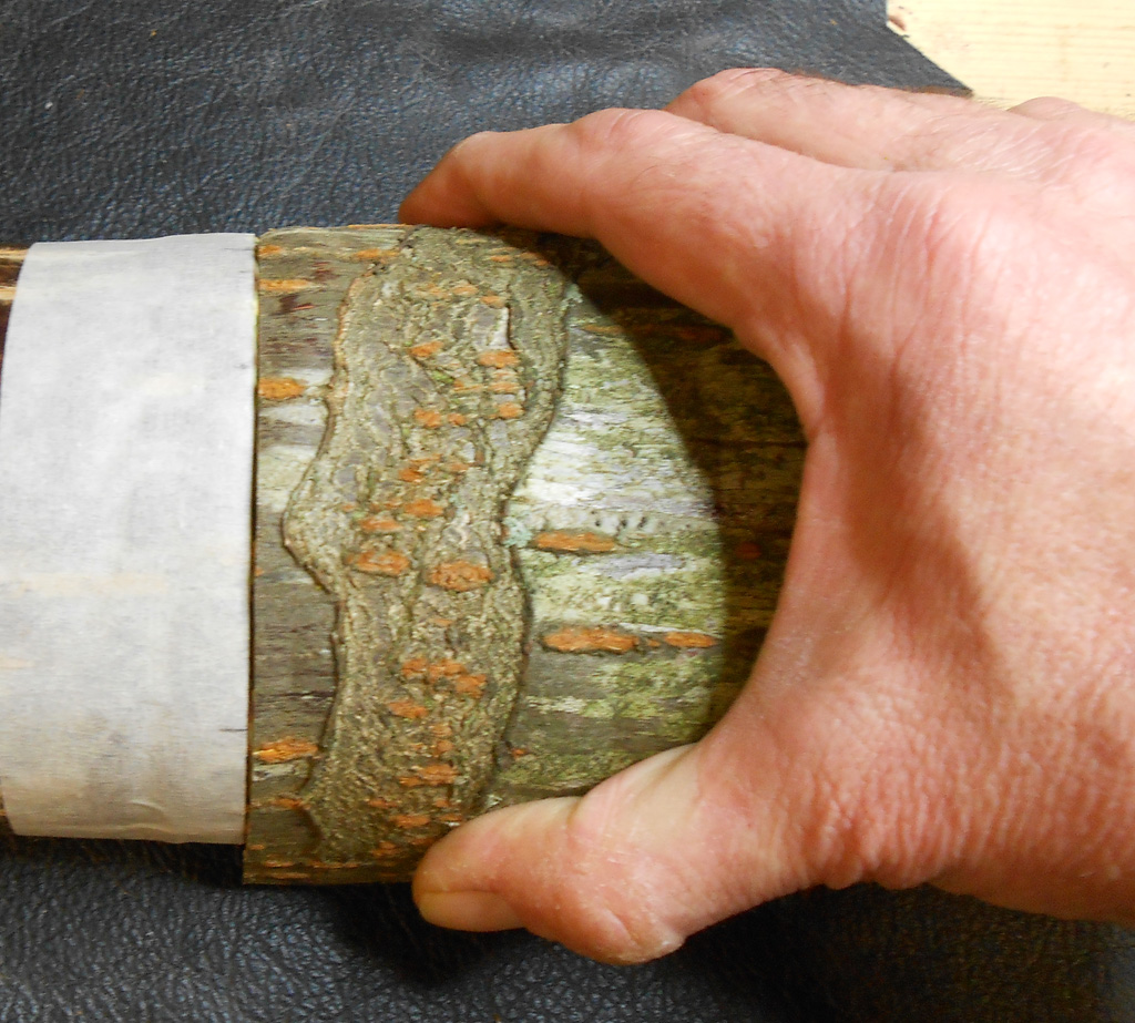 Danach wurden die Rindenstücke nacheinander auf die Außenseite des Köchers aufgeklebt. Die Stücke wurden alle mit Lederkleder bestrichen und nach dem Ablüften des Kleber fixiert und vollflächig mit einem Gummihammer festgeklopft. Da während der ganzen Zeit der Rohling im Köcker steckte, war das Festkloppen sehr gut möglich. Ohne den Rohling wären die Arbeiten so kaum durchführbar gewesen.