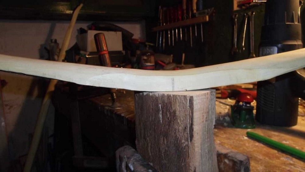 des Wurfarmes leicht gebogen. Nun passt das. Der Bogenbauch hat einige Astknubbel. Am Rand liegende hab ich rausgefeilt,was kein Problem war.