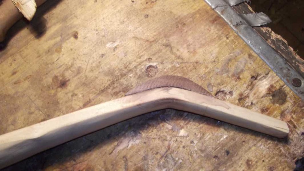 des Wurfarmes leicht gebogen. Nun passt das. Der Bogenbauch hat einige Astknubbel. Am Rand liegende hab ich rausgefeilt,was kein Problem war.