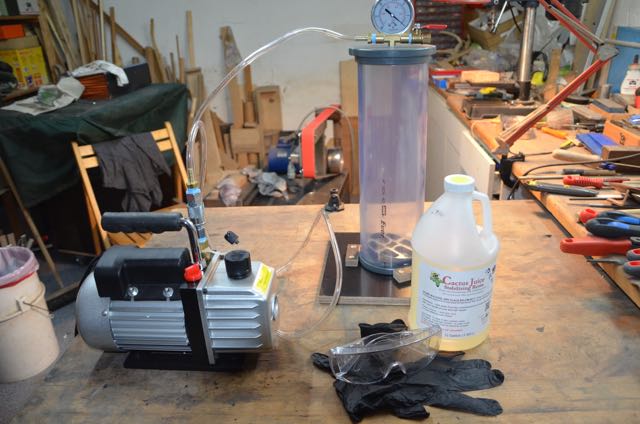 Holz in die Kammer, Aufschwimmsperre aufsetzen, Harz mit 2-3 cm Überstand einfüllen, Deckel drauf und die Pumpe bei geöffneten Leckventil einschalten. Es ist wichtig das Ventil langsam zu schließen um das aufschäumen zu kontrollieren. Sonst läuft man Gefahr Harz in die Pumpe zu ziehen. Ich habe keine Lust die Pumpe zum reinigen auseinander zu nehmen. Diese Phase kann je nach Dicke und Feuchtigkeit einige Stunden dauern – bei meinem zweiten Lauf habe ich 6 Stunden evakuiert.