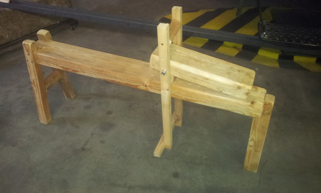 Falls du vor dem Abschneiden dann Angst hast, dass das Holz bei den Schrauben bricht, dann kannst Du noch unten eine schräge Verstrebung zwischen Beine und Sitz anbringen. Dann steht das erdbebenfest.