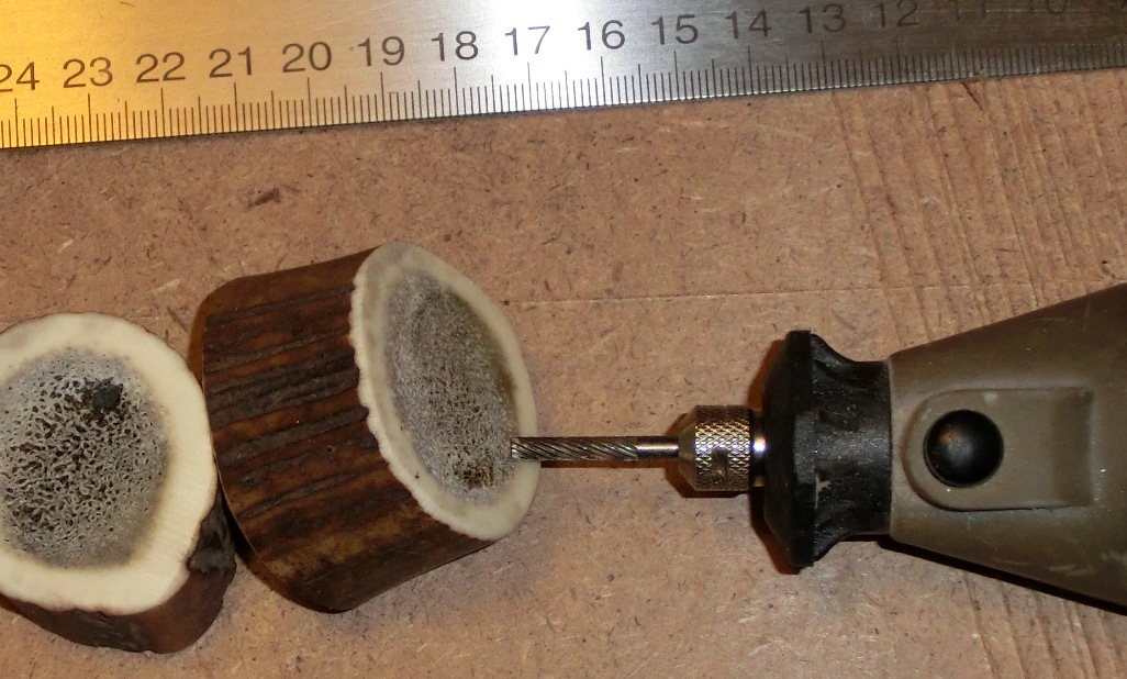 Dann, von einer Abwurfstange, einige Ringe abschneiden und mit einen Dremel vom Spongiosa befreien, das ist eine Arbeit die man tunlichst ausserhalb von Wohnräumen machen sollte, dagegen ist das Arbeiten mit Horn mit angenehmen Düften verbunden. ::)
