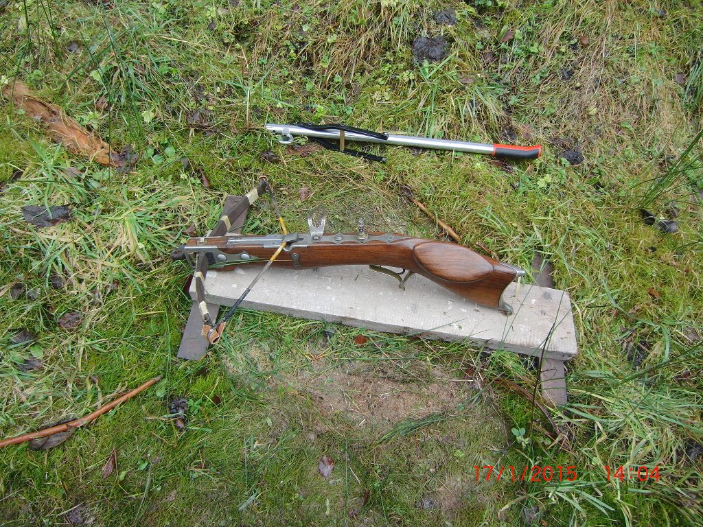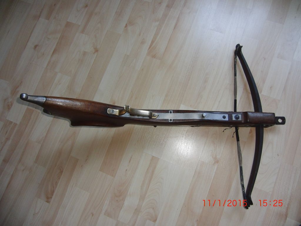 Weiss jemand etwas über diesen Armbrusttyp? Ich habe nur durch ein Bild in einer abgelaufenen Auktion einer Armbrust der gleichen Bauart herausgefunden das sie so um 1900 gebaut worden ist. Sie hat einen sehr starken Bogen, denke um die 400kg Zugkraft. An der Armbrust ist alles original und Schloss funktioniert auch.