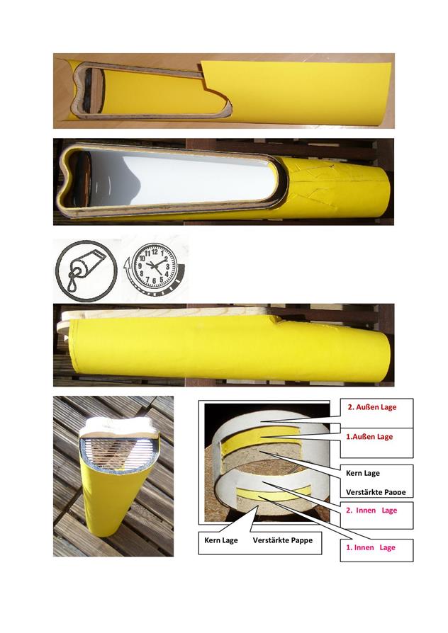 Als Papier nehme ich 5 Lagen Fotokarton 50x70 cm die miteinander und nacheinander verklebt werden (Bild). Die Schwierigkeit liegt darin das dieser Korpus von allen Seiten betrachtet eine konische Form ergeben muß, unter beachtung das das offene Ende wo die Flechtung eingefügt wird, der Durchmesser der späteren einfügung des Flechtteils entspricht, d.h. der Korpus muß als erster gefertigt werden um den Flechtteil anzupassen. Nach zusammenfügung beider Teile sollte die Seitenansicht einem Libellen Flügel gleichen -sagen die Japaner-