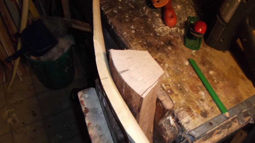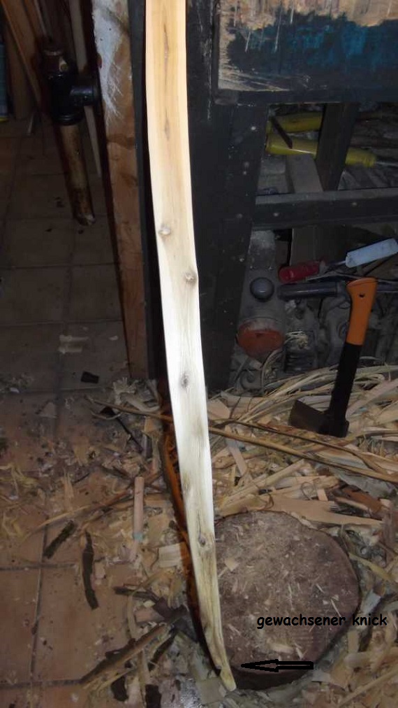 des Wurfarmes leicht gebogen. Nun passt das. Der Bogenbauch hat einige Astknubbel. Am Rand liegende hab ich rausgefeilt,was kein Problem war.