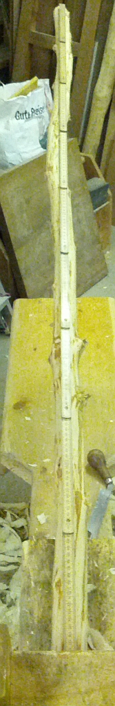Erst mal den Rücken und quer durch den Markkanal Dann die Mitte des Staves: Und gleich der Griff: Und dann gehts dem Stave ans Fleisch, bis der Markkanal sichtbar wird: Bisher verwendet Werkzeuge (Fotos davon mach ich mit der Nikon beim nächsten Werkstattbesuch):