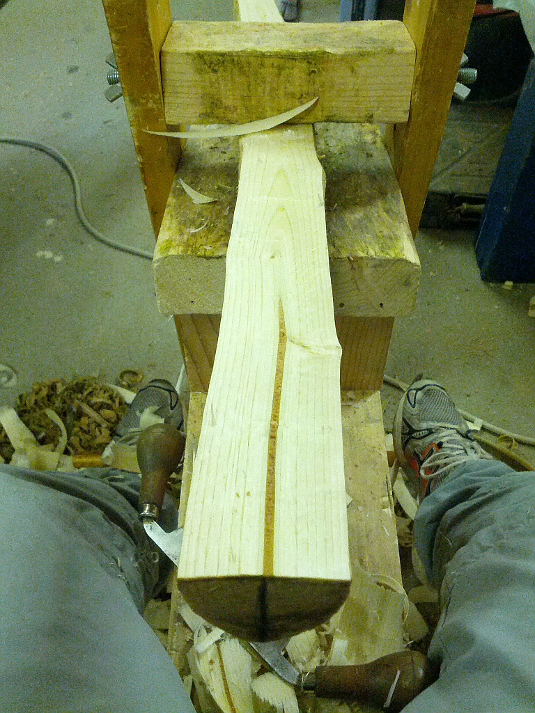 Erst mal den Rücken und quer durch den Markkanal Dann die Mitte des Staves: Und gleich der Griff: Und dann gehts dem Stave ans Fleisch, bis der Markkanal sichtbar wird: Bisher verwendet Werkzeuge (Fotos davon mach ich mit der Nikon beim nächsten Werkstattbesuch):
