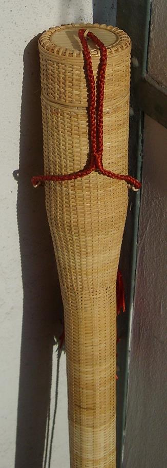 Länge 106 cm für 8-10 Pfeile die ich beim Schießtraining dabei habe. Das schwierige dabei ist der Übergang von der Röhre in den konischen Teil wo sich die Federn befinden.Die Kordel ist selber geflochten nach der Japanischen Flechttechnik Kumihimo, dafür brauchte ich ca. 70m Satinkordel mit 2mm Stärke. Der längliche Knoten der zu sehen ist , ist ein japanische Schiebeknoten, der durch verschieben, die Kordel verlängert um den Köcher über die Schulter zu hängen und den Deckel zu halten ,oder durch verschieben die Kordel verkürzt um den deckel abzunehmen.