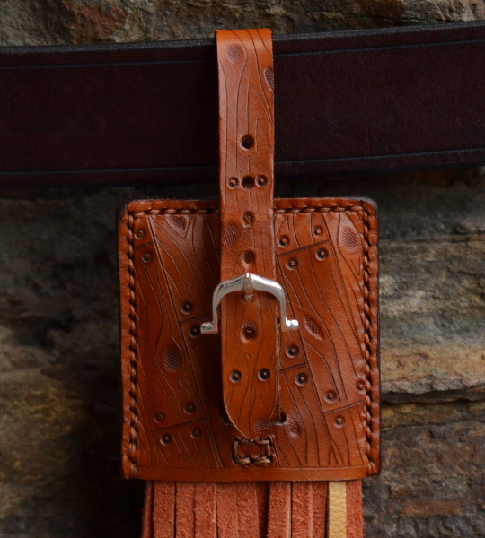 Hier ist ein von mir gefertigter Pfeilreiniger aus Leder mit Punzierungen im "Holzdesign" und mit mehrfarbigen Puscheln.