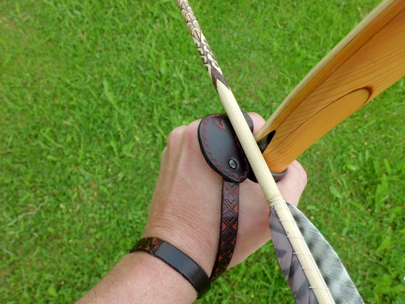 Zusätzlich habe ich einen Protektorring, einen Sehnenhalter und einen Gürtel gefertigt und das Griffstück seines Reiterbogens mit eingefasstem Schlangenleder versehen.