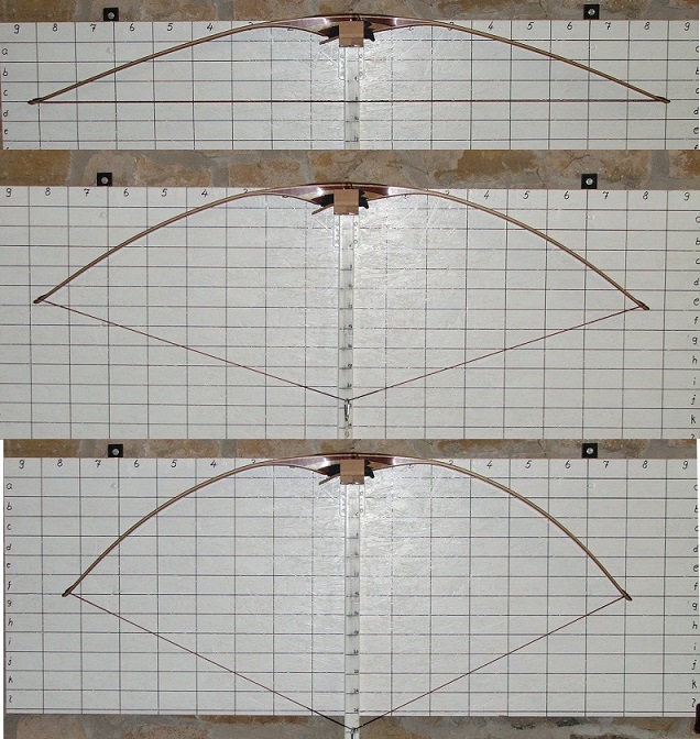 AMO mißt immer noch vom Pivotpunkt (Druckpunkt, tiefste stelle des Griffs) aus und addiert 1 3/4 'Zoll dazu. Das gleiche Ergebnis gibt es also nur, wenn es vom Pivotpunkt bis zur Bogenvorderkannte 1,75 Zoll sind (44,1mm) und bei diesen Bogen sieht es nach den Bildern eher nach 1,5 Zoll (37,8mm) aus. Demnach dürften die Ergebnisse der Auszugsmessung um 6,3 mm differieren zwischen AMO Messung und Messung vom Bogenrücken aus.