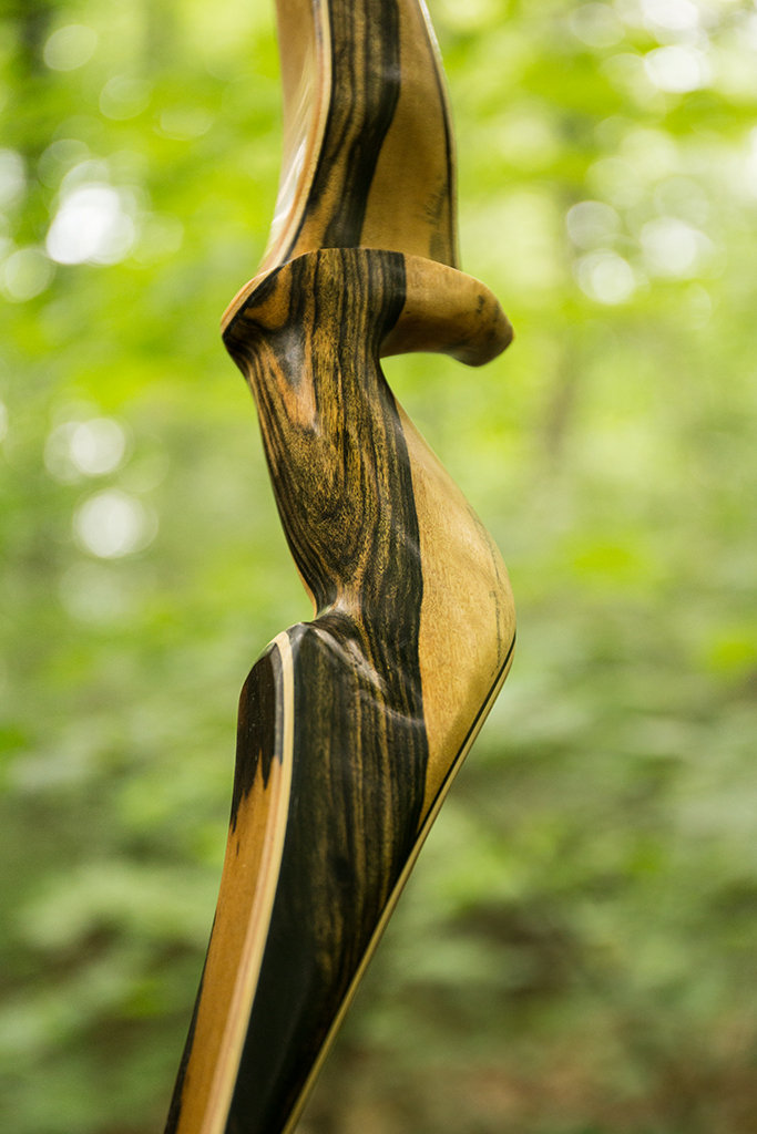 Das Design hat mich damals überzeugt und es kann ja nicht sein das einer meiner "Kunden" nen schnelleren Bogen als ich hat. Alsoooo.... die Unterschiede zum Vorgänger sind: Zirkote-Furnier unter 1 mm Klarglas (wieder das "gute"), die "Recurves" arbeiten jetzt sanft mit, es ist keine extra Schicht Bambus mehr in den Recurves ...sondern die sind mit ner Schicht Carbon verstärkt, ab beginn der Recurves ist der Bogen nur noch 9 mm breit und somit hat er weit weniger Handshock als sein Vorgänger..der Auszug ist jetzt bei "Alexfreundlichen" 30 Zoll ...nur mit den 53 Pfund tu ich mir auf Dauer noch etwas schwer.. nach 40-50 Pfeilen ist da bei mir einfach die Luft raus. Dafür hab ich etwas mit der Griffform "gespielt" und meine Hand sitzt bei dem Bogen wirklich perfekt "im Bogen". Als alter "Klammerer" mag ich es einfach wenn der Griff etwas ergonomisch ist. Ausserdem zwingt mich der Griff den Arm in der richtigen Haltung zu halten, denn einen Sehnentreffer auf dem Unterarm mit dem Bogen tut echt wehhh! :D