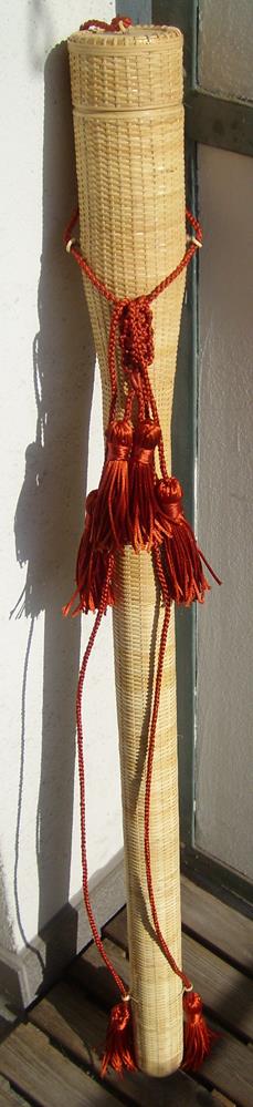 Länge 106 cm für 8-10 Pfeile die ich beim Schießtraining dabei habe. Das schwierige dabei ist der Übergang von der Röhre in den konischen Teil wo sich die Federn befinden.Die Kordel ist selber geflochten nach der Japanischen Flechttechnik Kumihimo, dafür brauchte ich ca. 70m Satinkordel mit 2mm Stärke. Der längliche Knoten der zu sehen ist , ist ein japanische Schiebeknoten, der durch verschieben, die Kordel verlängert um den Köcher über die Schulter zu hängen und den Deckel zu halten ,oder durch verschieben die Kordel verkürzt um den deckel abzunehmen.