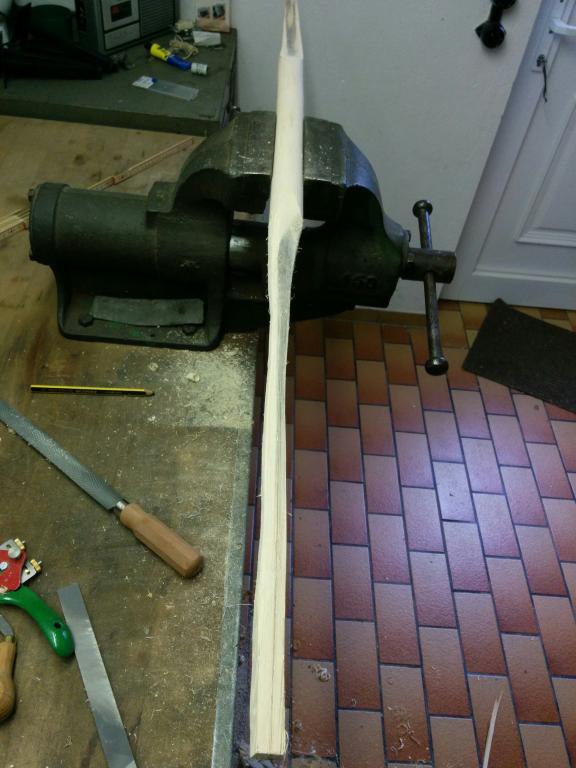 Im Wesentlichen nach der Anleitung von Peter "Youksakka" Berhorst bin ich gut voran gekommen, bis ich dann beim Ausarbeiten der Wurfarme mal zum Ziehmesser greifen wollte...