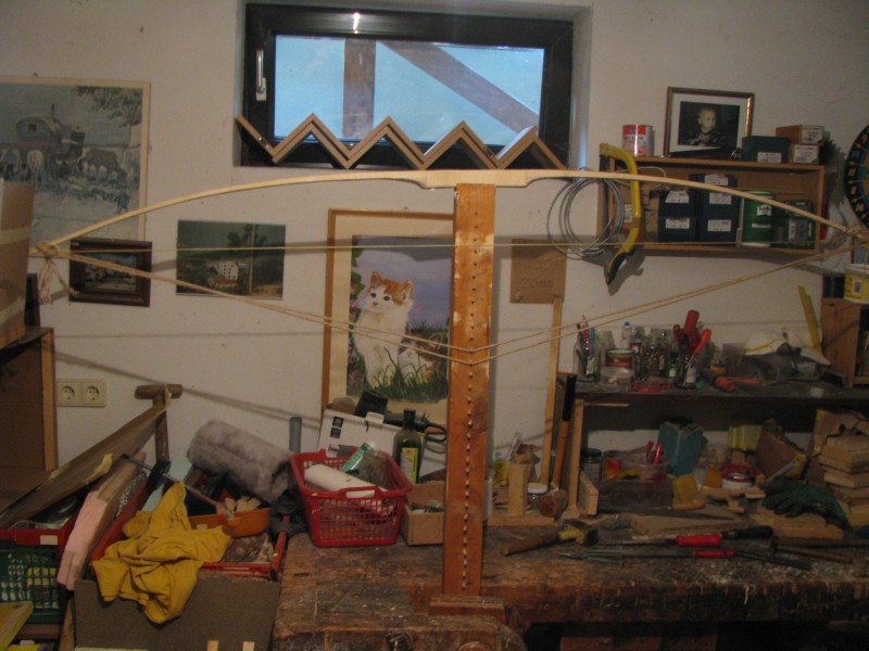 Am zweiten Bild wurde dann schon mit der zweiten Sehne gespannt und der Bogen hat sich um 11