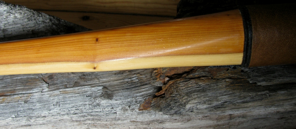 Entstanden aus einem kurzen, verästelten aber feinringigen Eibe-Stämmchen aus dem ich die besten Stücke mühsam herausgeschnitten hab. Die Take-Down-Hülse hab ich mir passend dazu bestellt. Ich wollte gerne was kleines handliches, einen Reisebogen. Hatte nun im Schwedenurlaub endlich Gelegenheit zum Einschießen. Wirft subjektiv sehr gut, Die Eibe federt geschmeidig und ich liebe einfach das Burgunderdesign. Der charakteristische Setback im Griff fehlt bei diesem Bogen natürlich, macht aber nichts.
