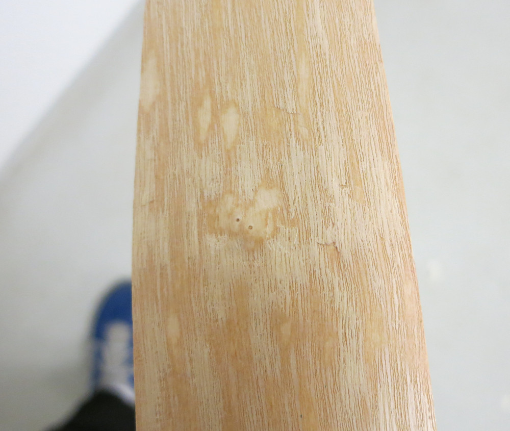 "Normalerweise" lässt man bei einem Astloch etwas Material überstehen. Man baut im Wurfarm eine steife Zone ein. diese beginnt und endet natürlich nicht nur im Bereich des Astes sondern läuft davor und dahinter etwas aus. So ergeben sich mit jeder dieser Stellen etwa 5cm nicht biegender Bereich.