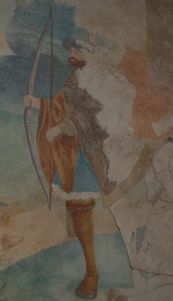 Zw. 1525-1535 gemalt, entw. Hl. Sebastiandarstellung oder jagdl. Kontext, ein Großteil noch übertüncht.