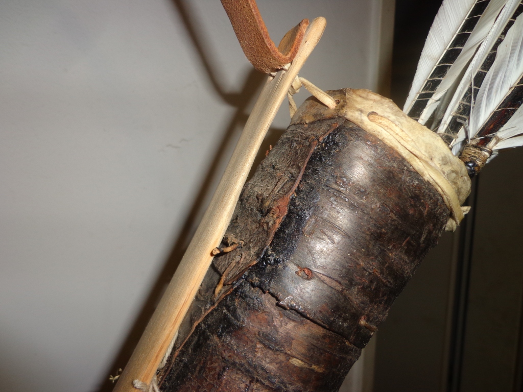 Die Rinde stammt von einer Wildkirsche. Die Bandagen sind aus einer Rehdecke von einem Jäger. Der Zylinder ist mit Rohhautstreifen vernäht und mit Birkenpech verklebt. Als Boden dient eine Scheibe von einem Ast und ist mit Rehhaut überzogen.