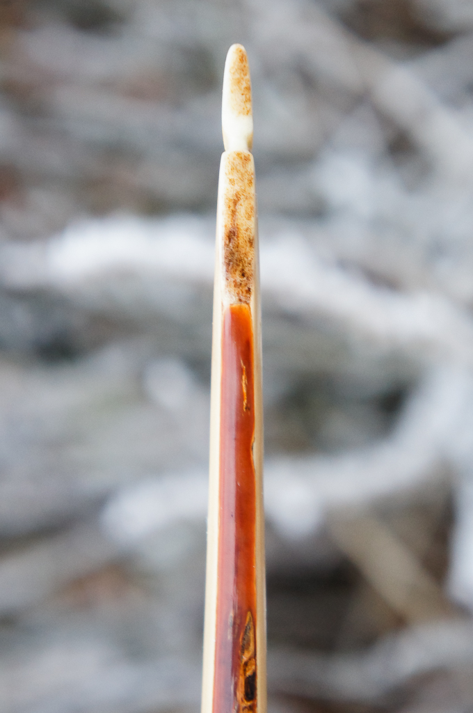 ein Haselnuss-Flachbogen mit einem Backing aus Kirschrinde, Geweihnocken und einer Pfeilanlage aus Büffelhorn. Der Bogen zieht sich außerordentlich angenehm und schießt präzise.