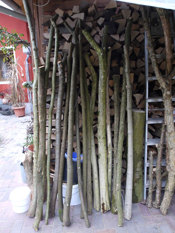 Die Notschlachtung von gestern: Von links: Weissdorn, Schlehe, Hartriegel, Pfaffenhuetchen, Holler und ein fettes Stueck Esche. Das Zeugs ganz rechts an der Leiter ist Kornelkirsche, die ist aber leider nicht bogentauglich und auch nicht von gestern.