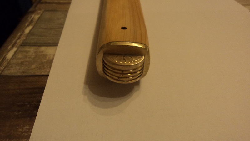 Der Handgriff wurde mit einer Art Spachtelmasse aus Bienenwachs, Baumharz und Schleifstaub (Eibe) gemixt und geklebt, ebenso der Knauf hinten. Fixiert wurde der Knauf mit einem Messingstift im Holz. Paßstifte aus Messing für den Handgriff müssen noch gefeilt werden.