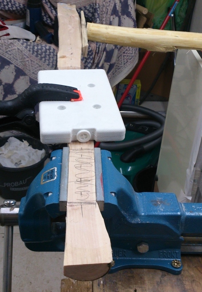 Zum Festzwingen: Ich mach das mittlerweile mit so ca 8cm langen Kloetzchen. 2 Loecher mit 2 fetten Spax und den Rohling damit mit ensprechneden Hoelzchen zum Unterlegen auf einen alten Balken gepinnt. Haelt genauso fest wie Schraubzwingen,