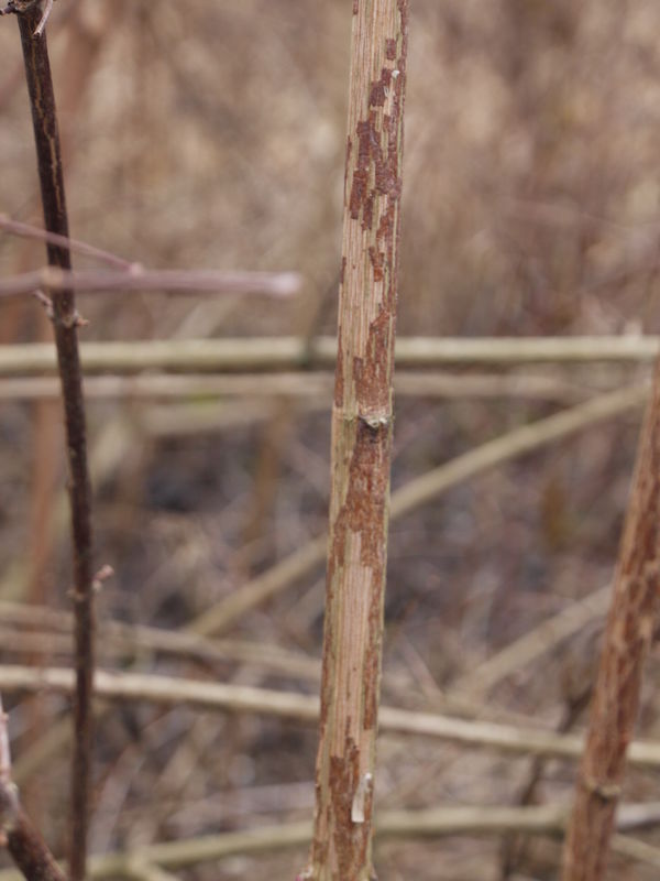 Rinde vom dickeren Teil und runtergefallene Blätter wäre noch interessant. Deutzie vielleicht? Ich find das ist auf den Bildern nicht genau zu erkennen.