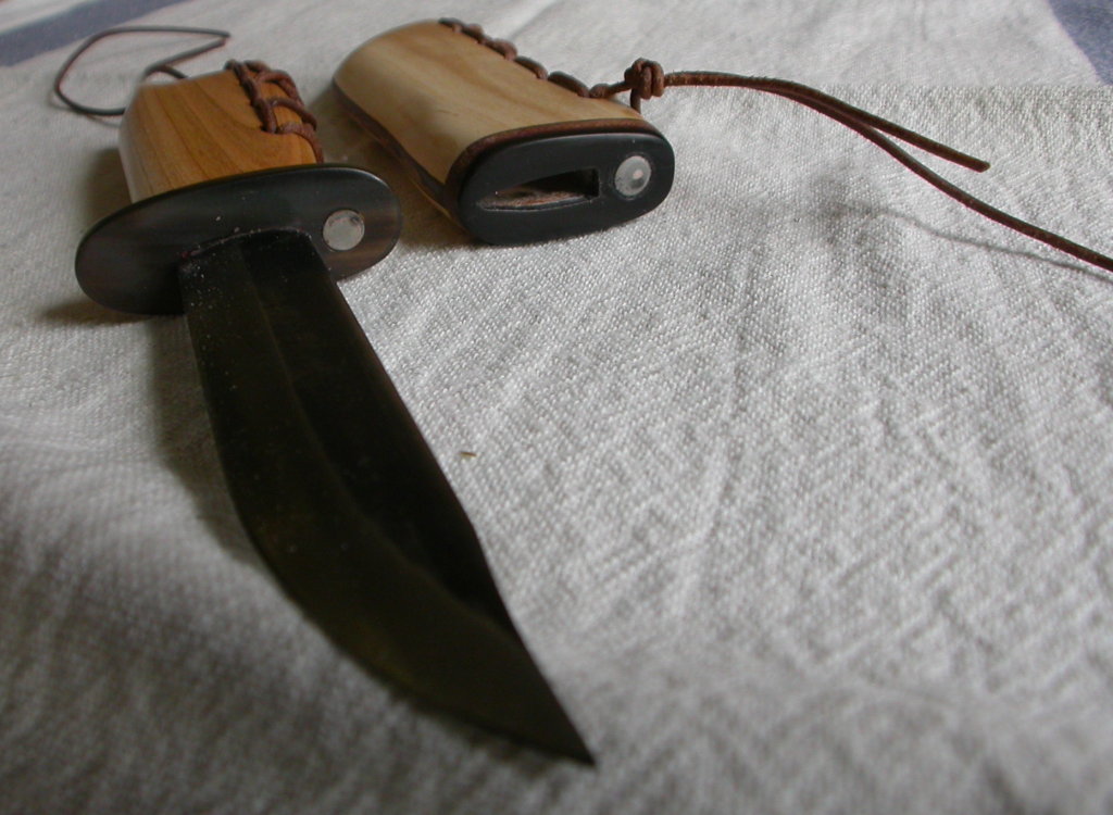 Wie oben geschrieben, kann die Strippe an der Scheide allerdings genauso gut zum Befestigen an irgendwas benutzt werden, meiner bescheidenen Erfahrung als frühjugendlicher Fahrtenmesserfetischist nach sogar viel besser als diese piefigen Lederlaschen, die die Scheide immer haben senkrecht baumeln und zuverlässig im Oberschenkel rumstechen lassen, bzw. verhinderten, daß man das Messer mit nur einer Hand ziehen konnte.