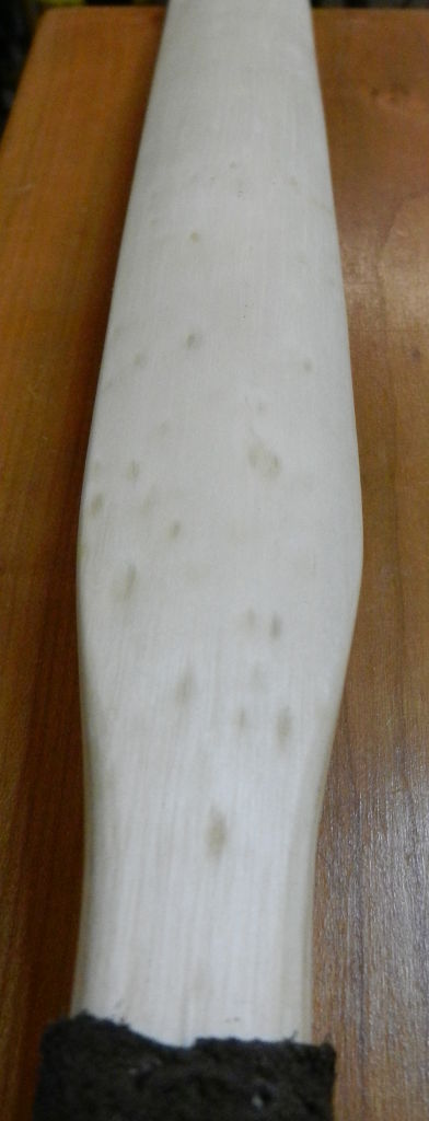 Was an Fas 5cm breit fast parallel bis 15cm vor den Tips dann Verjüngung auf 1,5cm; Dicke fast konstant 1,5 cm flacher