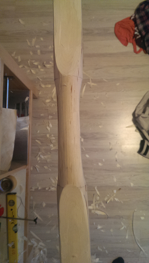 Also der Rohling hat grade eine Länge von leider nur 174 cm. Die WA wurden auf ca. 2,5 cm dicke und eine Breite von 3,5 cm an den Enden gearbeitet. Der Griff ist etwa 15 cm lang und 3 cm breit. Die Jahresringe haben ca. 3 mm.